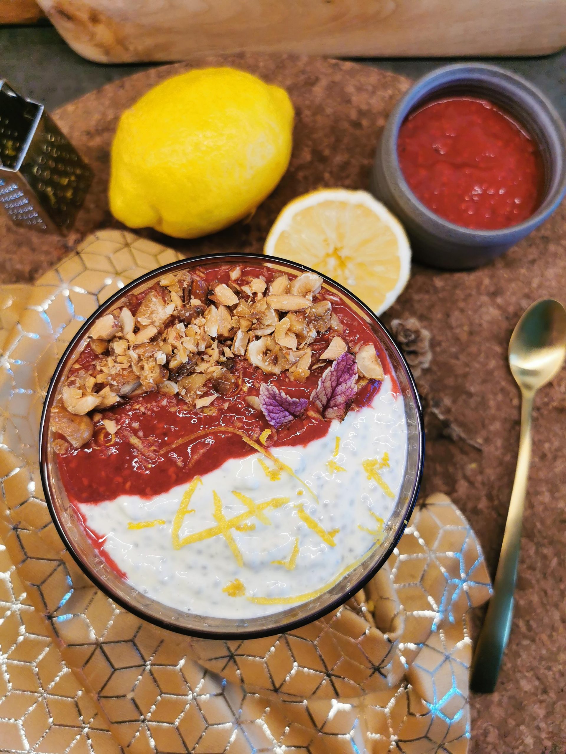 Chiapudding med sitronsmak, servert med bringebær- og lakrissaus!