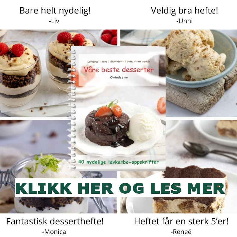 Vi har laget den ultimate samling av lavkarbo/keto dessertoppskrifter – «Våre beste desserter». Vil du servere de beste dessertene trenger du dette heftet. Du finner tradisjonelle desserter som hjemmelaget gelé med vaniljesaus, sjokoladepudding og dronning Maud-dessert, til tiramisu og sjokoladefondant.
