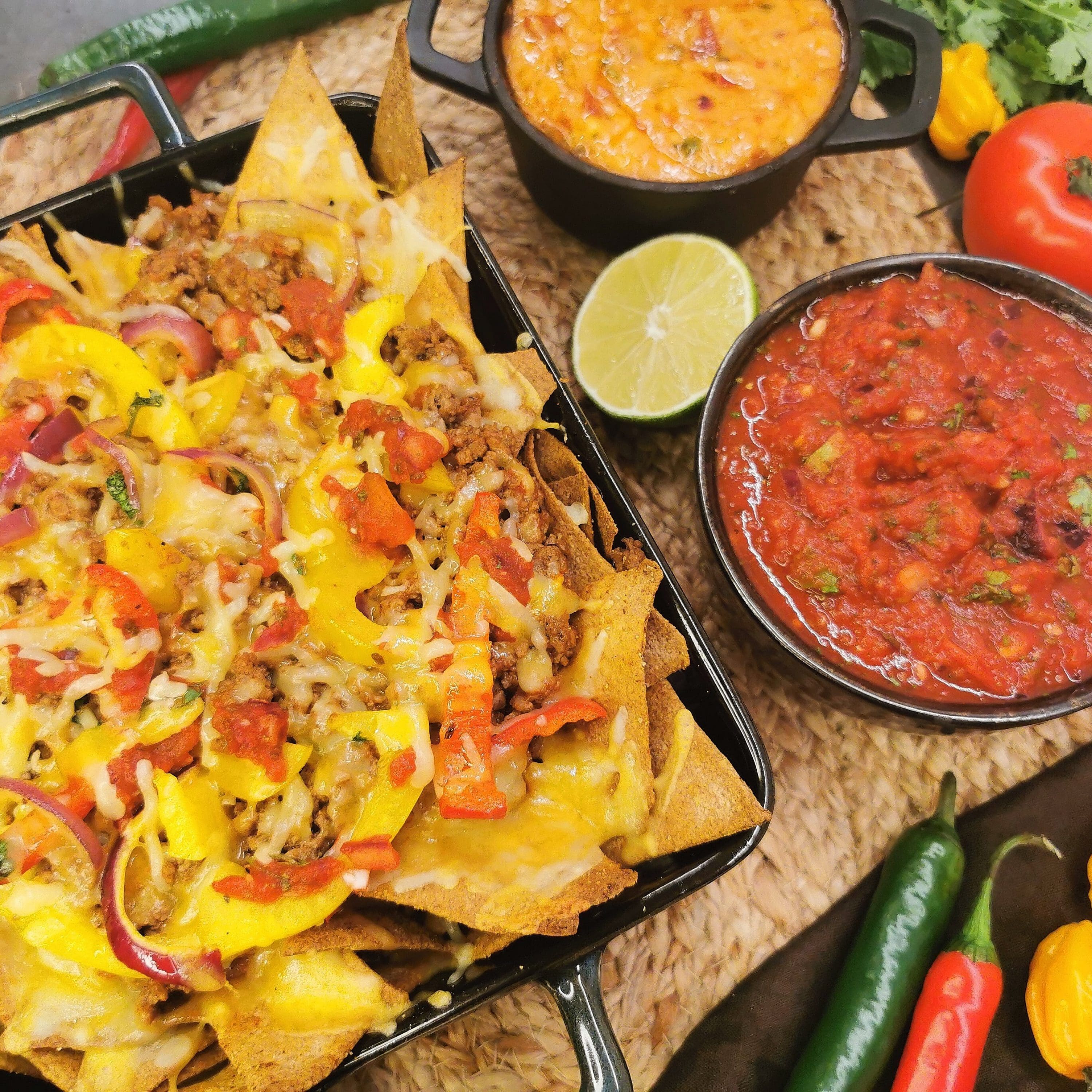 Nachos passer godt sammen med dipper som rømme, guacamole, salsa og queso dipp, som er en meksikansk ostedipp. Ostedippen kan du enten severe som en dipp ved siden av retten eller hellen den over kjøttdeigen , istedenfor revet ost. Begge deler smaker skikkelig godt.
