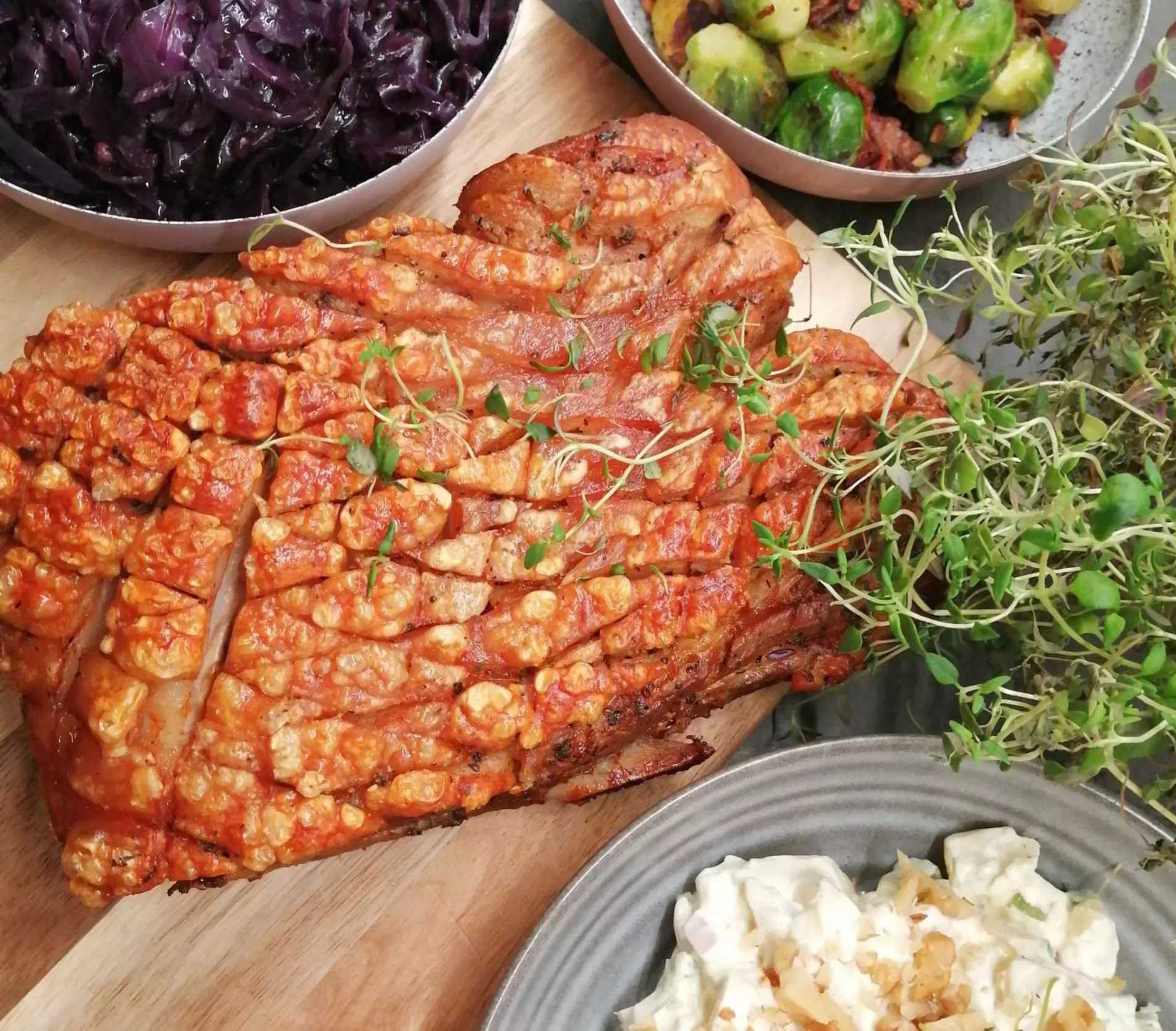 - Skru ned temperaturen i stekeovnen til 200 grader og fjern aluminiumsfolien som dekket formen. Stek i ca. 1,5 time. Følg med mot slutten av steketiden, og nyt synet av at svoren popper og blir sprø.